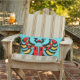 This outdoor fabric pillow for your decor is aqua blue with a big bright colourful abstract scarab beetle in colours of black, yellow, blue and yellow on both sides.