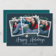 Elegant and festive holiday photo card frames three of your favourite square photos with a subtle deckled edge border and green and white holiday foliage peeking out at the corners. "Happy Holidays" appears along the bottom in white calligraphy script, with your names and the year beneath.