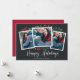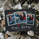Elegant and festive holiday photo card frames three of your favourite square photos with a subtle deckled edge border and red and green holiday foliage peeking out at the corners. "Happy Holidays" appears along the bottom in white calligraphy script, with your names and the year beneath.