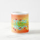Cheerfully decorated mug in bright and vivid colours with bubbles and hearts and rays of light to start the day in your best mood