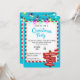 This is a bright and cheerful Christmas party invitation. The background is a vibrant blue, and at the top, colourful Christmas lights are strung across, adding a festive glow. The border of the invitation has red and white candy cane stripes, enhancing the holiday spirit.