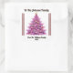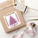 A beautifully wrapped gift sits on a festive surface, adorned with a vibrant sticker showcasing a whimsical pink Christmas tree.