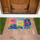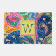 This cute monogrammed door mat features a bright and colourful geometric abstract pattern in shades of pink, blue, green and yellow. Personalise the monogram with your choice of initial.