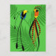 Colourful vector art of a pair of fictional exotic birds of paradise with long tail feathers and bright plumage on a green jungle like background.