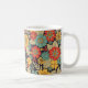 This modern floral coffee mug features trendy shades like bright red, orange, teal, and pale yellow on a dark navy blue background.