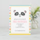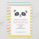 Bright colourful multicolor panda children's birthday party invitation. Graphic stripe backer design, colour can be changed. Part of a collection.