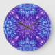 Seamless winter pattern with neon snowflakes. Bright crystal ornament. Festive texture with icy mandalas on a blue background. Pattern with purple and blue snow decoration.