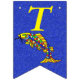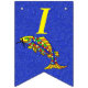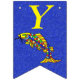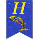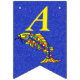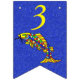 This flag shaped bunting Happy Birthday banner has a bright colourful festive abstract fish in yellow, blue, and orange on a vibrant deep blue background with tiny sparkle look flecks. Customise the birthday year and the text with the templates.