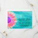 This colourful Save the Date Card is decorated with an original watercolor painting of a flower in shades of pink and purple on a turquoise background.