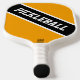 This fun sporty design features big white sports letters inside a diagonal black stripe highlighted with white stripes on a bright golden yellow background. The colours and current PICKLEBALL text in this template design can be personalised.