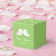 This wedding favour box features a pair of cute love birds facing each other. The top of the box features customisable text for you to add your personal thank you message or leave as it reads: "Thank you for sharing our special day with us." The front of the box, under the love birds, is customisable text for the names of the bride and groom and their wedding date. The background colour is lime green.