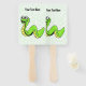 This program hand fan is white with green polka dots and a neon green and yellow snake with a smiling face. Customise your text on the front and back with the templates.