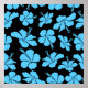 Bright hawaiian seamless pattern with tropical hibiscus flowers on black background in blue colors.