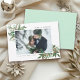 These custom seasonal greetings are joyful bright designs featuring your favourite photo surrounded by evergreen misteltoe sprigs and cotton watercolors as well as elegant typography showing your personal, easy to customise message - here it is reading: Merry & Married. This version shows a delicate cheerful pastel light green dot pattern on the back.