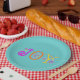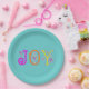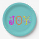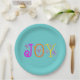 Bright and Cheerful letters spell out J O Y. Teal background for a light- hearted summer plate great for all your celebrations.