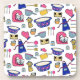 From original artwork. Blue, pink and yellow motifs on a white background.