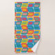 This towel set has a bright pink washcloth, a yellow hand towel, and a bath towel with a mid-century modern design of bright colours that make rounded rectangles with other rectangles inside formed by a collection of lines.