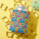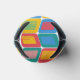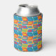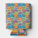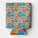 This can cooler has a mid-century modern design of bright colours that make rounded rectangles with other rectangles inside formed by a collection of lines.