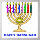 A bright Hannukah menorah with the words Happy Hannukah welcomes the holiday. Happy latke eating!