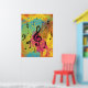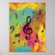 Unique and eye-catching, this cool and retro music design features musical notes in a circular pattern with a large treble clef in the centre on a bright paint splat and psychedelic tunnel background.