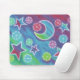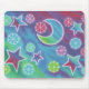 A brightly coloured night sky with shining stars and striped moon. Mouse pad with a purple, pink, blue and green customisable design for you to personalise with your own text, images and ideas. An original coloured pencil drawing by Jess Perry.