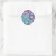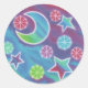 A brightly coloured night sky with shining stars and striped moon. Sticker with a purple, pink, blue and green customisable design for you to personalise with your own text, images and ideas. An original coloured pencil drawing by Jess Perry.