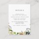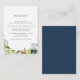 This elegant botanical wedding advice card features a border of watercolor painted leaves, oak fruit, and blue flowers.