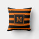 Modern, bright black and orange stripe monogrammed pillow- Wide black and orange stripes background. Centred is an orange monogram initial in modern lettering framed within a black and orange square. Identical on both sides. Modern, bright decor. Unique Halloween decor. Fun, monogrammed housewarming gift or dorm decor gift. You can get this black and orange pillow in different sizes and cloth options for modern black and orange decor or monogrammed bedroom decor accent.