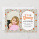 Reddish orange and papaya whip daisies floral design with one girl photo birthday invitation. Personalise the birthday party invites by adding your child's name, age, and party details.