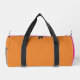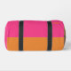 Orange letters for your monogram appear on the bright pink front side of the duffle bag. This colorblock duffle bag has two bright pink sides and two orange sides. All text can be edited or deleted.