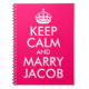 A bright pink customisable Keep Calm and Marry Jacob (any groom) parody of a classic design. Create a unique notebook for the bride. If the groom has a longer name, we suggest to select and reduce the size of the entire design. This will retain uniform font size on all lines.
