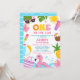 Colorful pool, beach or outdoors first birthday party invitation for baby girl featuring a pink duck floatie, pineapple, sun glasses, sun, beach ball, ice creams, tropical drinks and more. This colorful girls summer first birthday invitation is a cute way to set the scene for a fun first birthday party.
