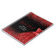 A beautiful bright red themed elegant watercolor dress gown on a black background with faux glitter at the top and bottom of the guest book.