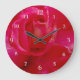 A close-up photograph of a bright red rose printed on a clock with pale pink numbers. This photo was taken at the Mesa Community College Rose Gardens in Mesa Arizona, where the climate is ideal for growing roses. Original photography copyright 2018 by Karen Coffelt.