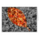 A selectively coloured autumn photograph of fallen crepe myrtle leaves, with a gold-framed leaf shape of bright red, orange, and yellow against a black and white background.