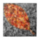 A selectively coloured autumn photograph of fallen crepe myrtle leaves, with a gold-framed leaf shape of bright red, orange, and yellow against a black and white background.