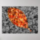 A selectively coloured autumn photograph of fallen crepe myrtle leaves, with a gold-framed leaf shape of bright red, orange, and yellow against a black and white background.
