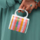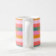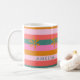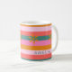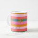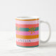 Cosy Christmas Bright Stripe and snowflake custom name coffee mug. Perfect holiday gift for tea, coffee or hot chocolate on cold winter nights. Get ready to celebrate the season in style with this fun and cheerful striped mug with unexpected Christmas colours—pink, teal green, golden yellow, and coral. A modern, colourful stripe pattern adds extra flair. Makes a perfect Christmas gift.