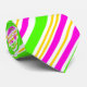 This tie has bright stripes of varying widths--lime green, magenta, yellow, and white--arranged in a diagonal pattern.