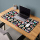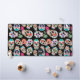 Bright and colourful images of sugar skulls make a fun pattern on this unique desk mat. There are several different skull images, all individual in various colours, and placed on a dramatic black background. Your two letter monogram is in white on a black circle banner at the centre bottom.