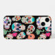 Bright and colourful images of sugar skulls make a fun pattern on this unique phone case. There are several different skull images, all individual in various colours, and placed on a dramatic black background.