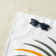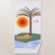 Beach towel with my original and simple but colourful vector design of a palm tree, bright orange sun and waves, with customisable initials.