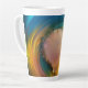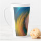 Original semi impressionist digital painting of tropical wave breaking at sunset. The sunlight is reflected in the wave in an array of bright oranges, yellow, pinks, teals and blues. Palm trees on the beach, curly tendrils of breaking water splash at the crest of the breaking wave. Days end viewed from inside the surf tube.