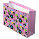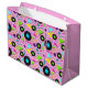 This gift bag features geometric shapes in bright, vivid colours on a pink background. It's available in 4 different sizes and has a retro vibe that we just love!