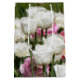 Bright white and pink tulips on a sunny day. The photo was taken in June 2022. The poster is suitable for interior design.