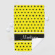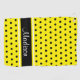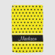 This design has a bright yellow background with black polka dots and black, bright yellow and white stripes. The name is in a script font and can be customised using the template field.