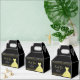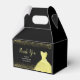 A beautiful bright yellow themed elegant watercolor dress gown on a black background with faux glitter at the top and bottom of the favor box.