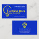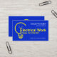 A bright blue cover features a creative yellow light bulb where the bulb filament is shaped into the words "Electrical Work". Below the filament lies the phone contact. Towards the upper corner is your prestigious name and job title with a slogan caption option to publicise your services near the base.