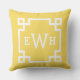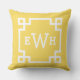 A bright yellow throw pillow featuring a customisable three-letter monogram inside a white Greek key geometric border frame. The cheerful white-on-yellow design brings sunny energy to living rooms, sunrooms, or bedrooms. Personalise with your initials or a couple's monogram for a happy, personalised gift.