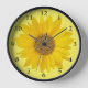 A close-up photo of a bright yellow sunflower on light yellow background with black numbers.